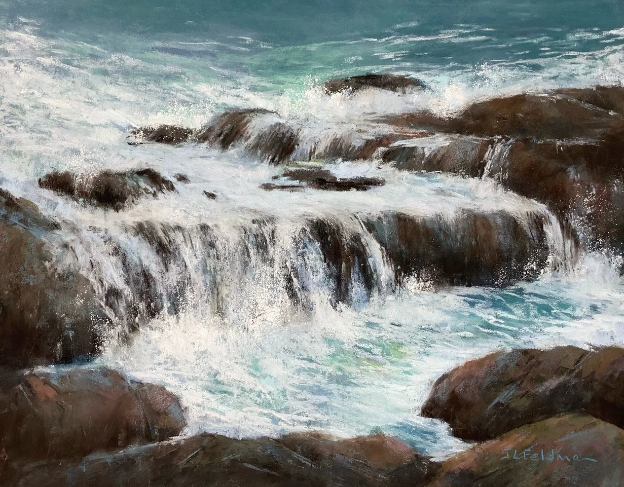 Joelle Feldman is a representational painter who seeks to capture the range of vibrancy, subtlety and shadow that nature offers at a given instant. Joelle worked in watercolor and oil for a time before she discovered pastels, which have become her medium of choice.