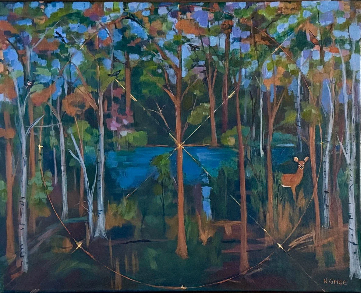 Nancy Grice’s paintings combine landscape and abstraction. Her current work is mostly acrylic, based on the view of the trees and skyline outside of her studio in Harpswell. The trees, in dynamic collaboration with the earth and sky, seem to be a perfect metaphor for connecting the dirt of earth with the cosmos.